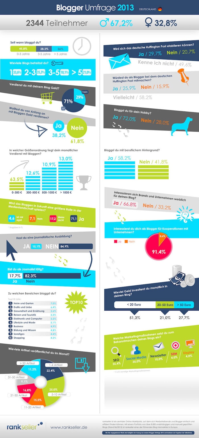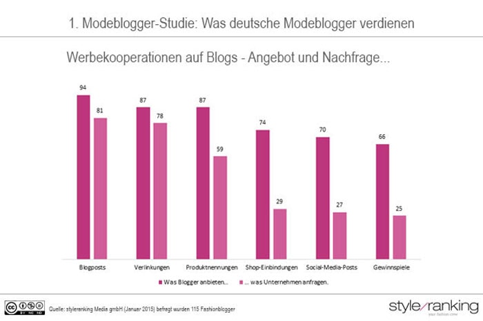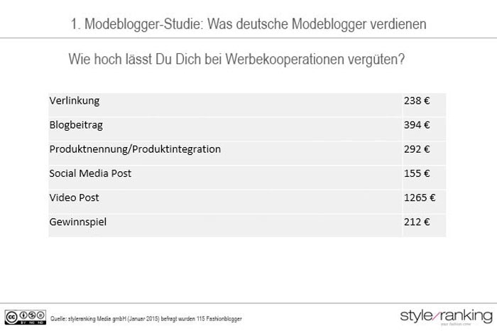 Die Deutschen hingegen verdienen offenbar weit weniger. Vergleicht man die deutsche Bloggerszene mit der internationalen fällt auf: Auch beim Modebloggen bleiben die Deutschen ihren Tugenden treu. Kontinuität und Seniorität zahlen sich aus, zu viel Selbstinszenierung wird vom Publikum hierzulande eher kritisch beäugt und nicht zuletzt scheint auch Bescheidenheit eine unfreiwillige Tugend zu bleiben. Laut einer Umfrage der Plattform Styleranking vom Januar diesen Jahres nehmen 50 Prozent der gut 100 Befragten gerade einmal 100 Euro im Monat ein; zwei Prozent verdienen zwischen 3.000 und 5.000 Euro monatlich. Die Haupteinnahmequelle ist laut dieser Studie das Advertorial, also ein bezahlter Beitrag, dahinter folgen Verlinkungen und Produktnennungen. Die aufgerufenen Preise liegen laut Studie bei durchschnittlich 400 Euro pro Advertorial, allerdings kann ein größerer, bekannterer Blog auch mit „deutlich mehr als 1.000 Euro vergütet werden.“ Bezahlte Links werden für durchschnittlich 240 Euro gesetzt, Produkterwähnungen kosten um die 300 Euro, Social Media liegt (noch) mit einer durchschnittlichen Vergütung von 155 Euro auf dem letzten Platz. Am besten bezahlt sind Videos, die den Bloggern durchschnittlich 1300 Euro einbringen können.