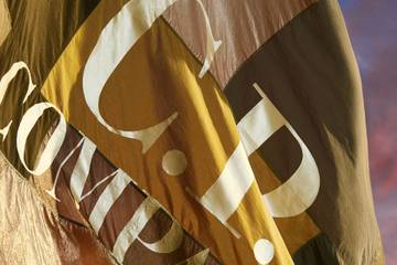 Im Mittelpunkt der Feierlichkeiten steht eine Patchwork-Fahne aus C.P. Company-Stoffen der Marke. Sie steht für die Grundpfeiler des Unternehmens: das Know-how in der Erforschung von Stofftechniken und die Entwicklung der Färbetechniken.