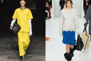 Diese Übertreibung drückt sich auf verschiedene Weise aus, wobei die Ergebnisse zuweilen einem Cartoon entsprungen sein könnten. Es gibt vergrößerte Details, wie Puffärmel, die an balzende Paradiesvögel erinnern, oder umgekehrt stark verkleinerte Elemente wie bei den Taschen von Jacquemus. Auch der Surrealismus, wie bei Schiaparellis Show,> die im vergangenen Januar für Aufsehen sorgte, spielt hier eine Rolle. Festliche Kleidung ist angesagt und kann einfach tagsüber getragen werden, wobei Verzierungen wie Kristalle und Pailletten ungeniert überstrapaziert werden. Aber der Überschwang kann auch bescheidener ausfallen. So werden einfarbige Outfits mit drapierten Formen und riesigen Schleppen verziert.