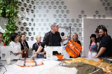 Am Stand auf der Bread && Butter by Zalando, wo der Brite seine Kollektion für Timberland vorstellt, dürfen die Besucher selbst tätig werden. FashionUnited traf ihn während eines Taschen-Näh-Workshops, in dem er Besuchern selbst an der Nähmaschine das Handwerk erklärte. Nebenan konnten T-Shirts gestaltet und Sukkulenten-Terrarien bepflanzt werden. Wir setzen uns gemeinsam in den eigens ausgelegten Rollrasen und sprechen über die Zusammenarbeit, Nachhaltigkeit und die neuen Genereationen von Konsumenten.