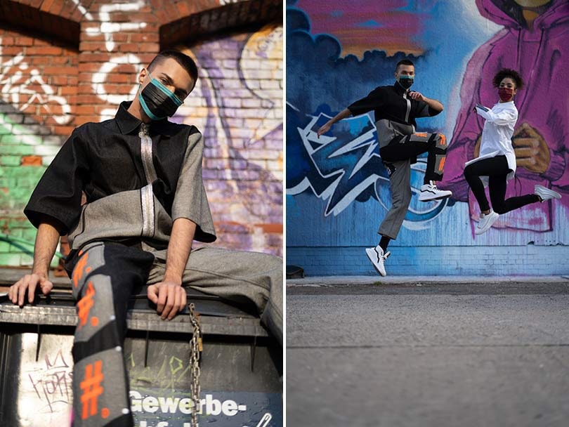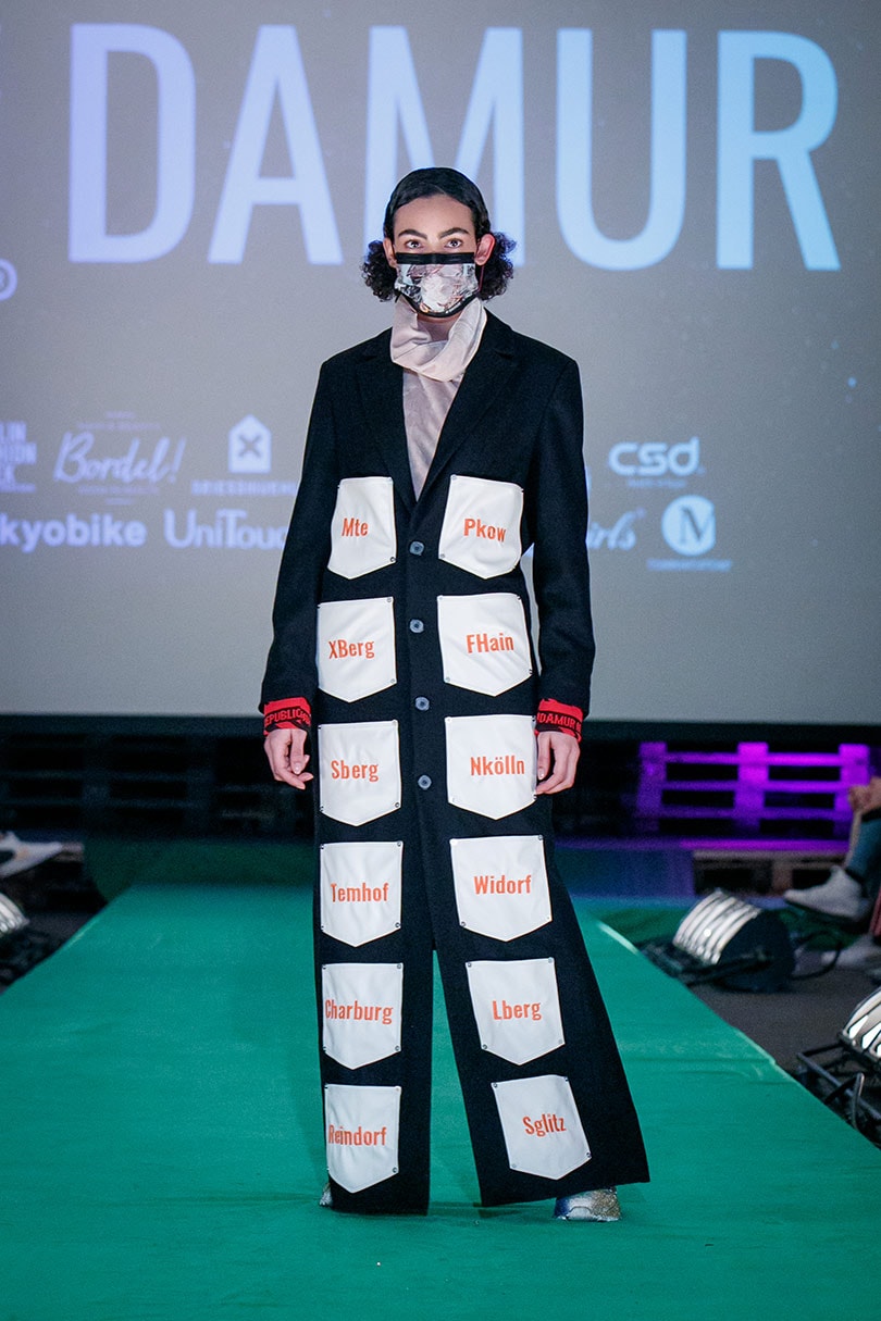 #Damur, ein Berliner High-End-Streetwearlabel, zeigte seine H/W 20/21-Kollektion auf der Berlin Fashion Week am 16. Januar im bald schließenden Club Griessmuehle. Für die Laufstegshow arbeitete der Designer mit CSD, einem 73 Jahre alten Unternehmen für medizinisches Zubehör aus Taiwan, zusammen, um die chirurgische Maske als modisches Accessoire neu zu interpretieren. Zwei spezielle Masken wurden als VIP-Tickets verwendet und von den Models auf dem Laufsteg getragen. Die medizinischen Masken wurden mit Darstellungen der Brother's Kiss und der Graffiti-Kultur, für die Berlin bekannt ist, bedruckt.