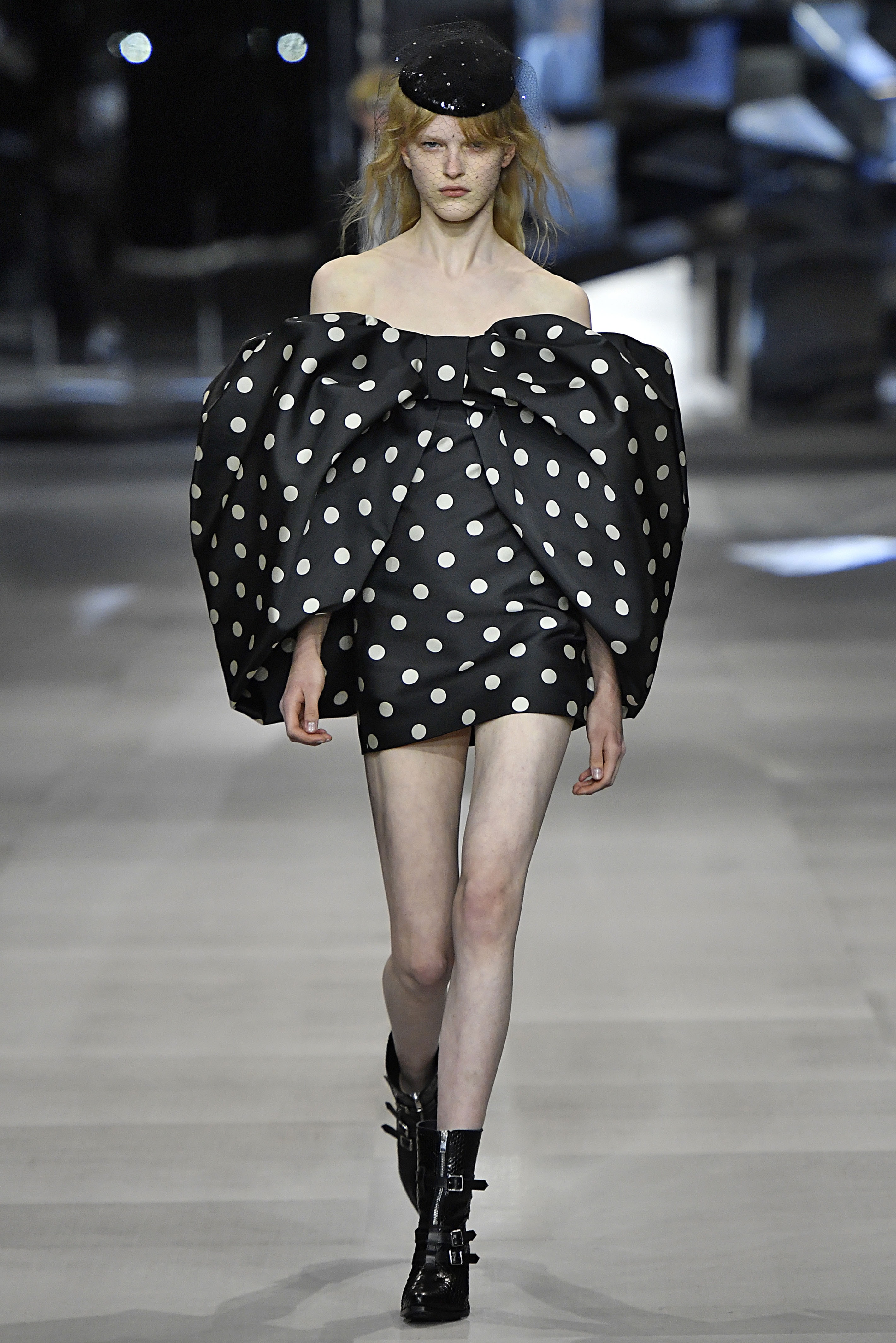 Vor einem Aufgebot internationaler Stars wie Lady Gaga hat Top-Designer Hedi Slimane seine erste Kollektion für das Modelabel Celine in Paris vorgestellt - und dabei den Look der Marke komplett verändert. Zum Start seiner Show ließ er ein Model im Pünktchenkleid aus einer sich drehenden, metallisch glänzenden Kubus-Struktur auf dem Laufsteg erscheinen - das Kleid eine einzige übergroße Schleife. Viele Zuschauer, darunter auch Karl Lagerfeld, Catherine Deneuve, Cara Delevigne und Virgil Abloh - jubelten, manch einer verdrückte gar eine Träne am Freitagabend.