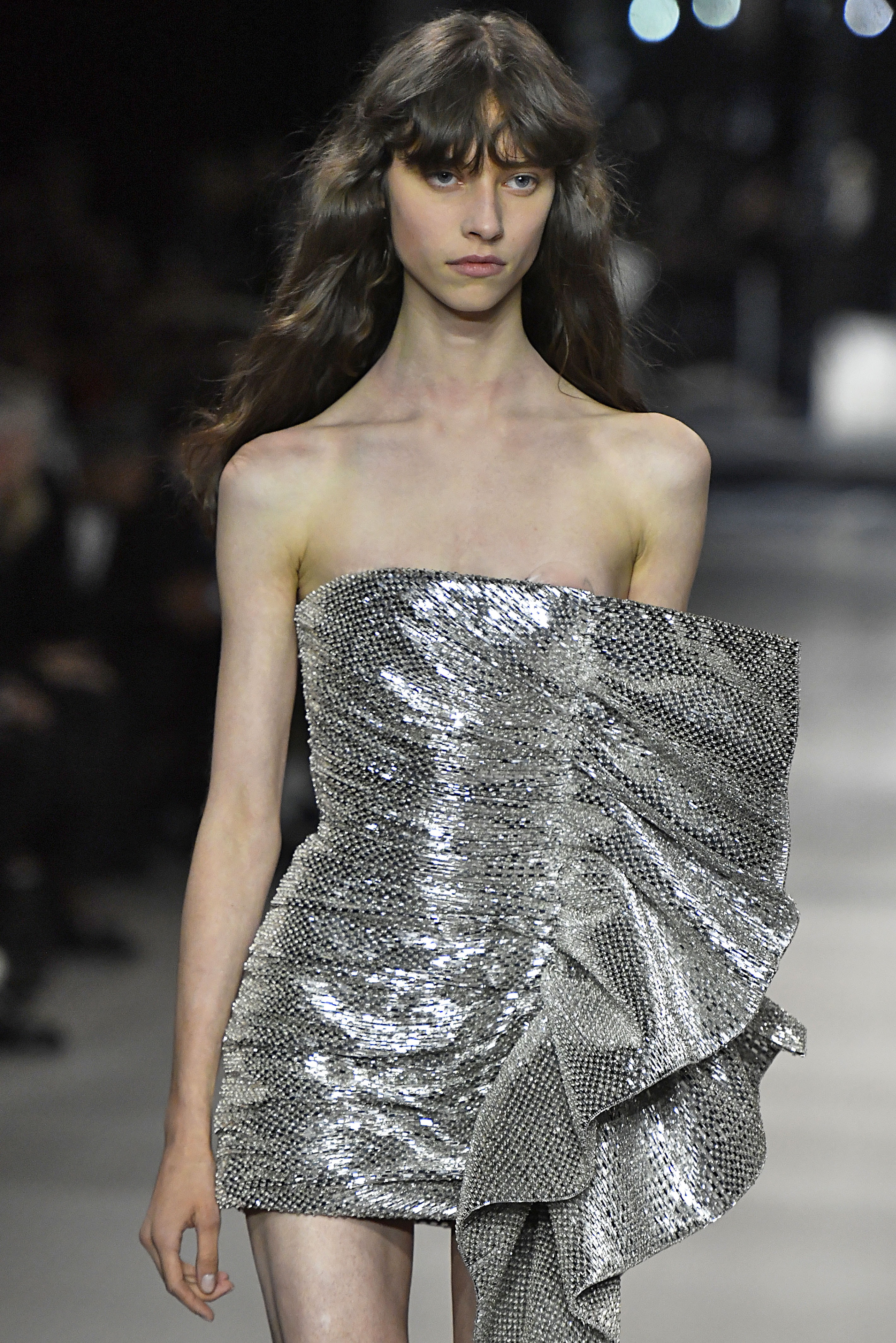 Die Marke Celine, die vorher von Phoebe Philo geführt wurde, war der Liebling vieler Moderedakteurinnen. Sie hatte den Ruf, intellektuellen Frauen zu gefallen, stand für erwachsenen, aber sinnlichen Minimalismus. Von dieser Ästhetik ist unter Slimane nicht viel geblieben. Minimal ist bei ihm allenfalls die Rocklänge. Seine Celine-Frauen tragen überkurze Babydoll-Kleidchen, die mit ihren ballonartigen Röcken, Volants und schimmernden Bolerojäckchen ein bisschen an Prom Queens denken lassen. Das Zuckrige, die Netzhüte und Pailletten bricht Slimane durch Nieten, Leder, Cowboyboots und viel Schwarz.