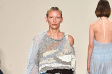 Die Kreativdirektorin des schottischen Modehauses, Fran Stringer, verwandelte hauchzarten Strick aus Nylon, Viskose oder Cellulose-Fasern in ultrazarte Kleidungsstücke. Darunter ein durchsichtiges, orangenes Strickkleid ohne Ärmel, das die Show eröffnete, Intarsienpullover so heilig, dass die Nähte fransig über die Seidenhosen hingen, welche ebenfalls am Saum ausgefranst waren. Ein schönes Blanket-Kleid aus Wolle im hellsten Grauton ergab einen Look, der sowohl gemütlich, also auch cool wirkte. Stringer bewies, dass Strick nicht nur etwas für den Winter ist.
