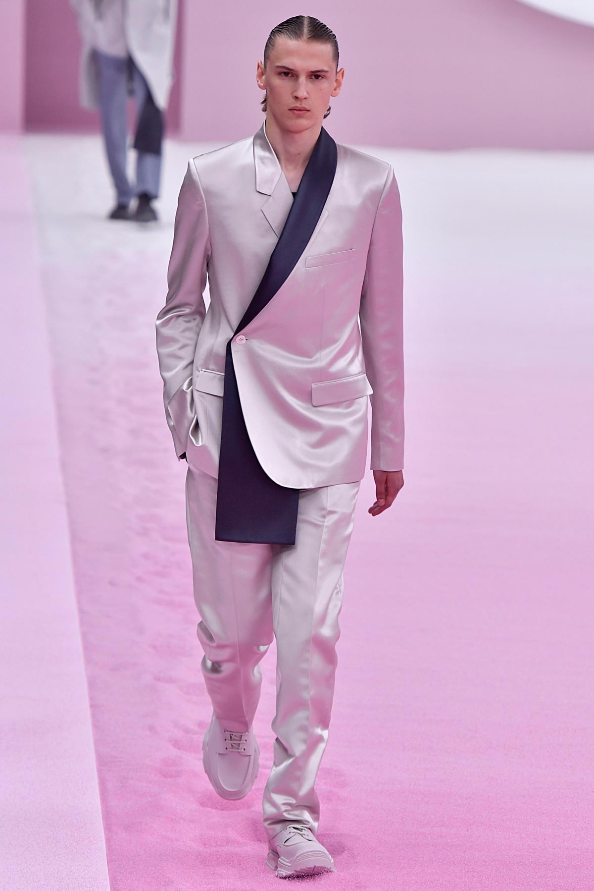 Bei Dior glänzten die Anzüge. Der Eröffnungslook bestand aus einem einreihigen Satinanzug mit Schärpe, kombiniert mit weißen Turnschuhen zeigte, wie man High und Low, Street und Modern Tailoring kombiniert. Bei Celine fügte Hedi Slimane der Abendgarderobe ebenfalls Glam hinzu: Er zeigte einen Disco-Fever-Anzug aus den 70er Jahren, der eng und schmal geschnitten war, wie wir es von seinen Schnitten erwarten.