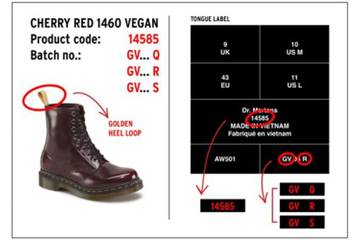Alle Kunden, die besagte vegane Stiefel in den beiden Farben zwischen Januar 2015 und 2017 gekauft haben, sollten ihren Produktcode und die Nummer der Fertigungsreihe prüfen. Diese lassen sich auf dem gelben Etikett an der Ferse ablesen (s. Fotos).