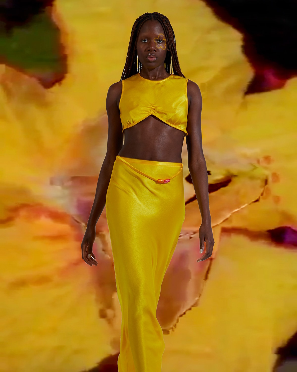 Die Farbe Ringelblume (Goldblüte) ist in der SS21-Saison sehr beliebt. Sie erscheint sowohl in Pantones LFW- als auch in NYFW-Berichten. Die "gelbe Farbe ist mit Gold und Orange durchzogen und hat eine wärmende Präsenz", so der Bericht.