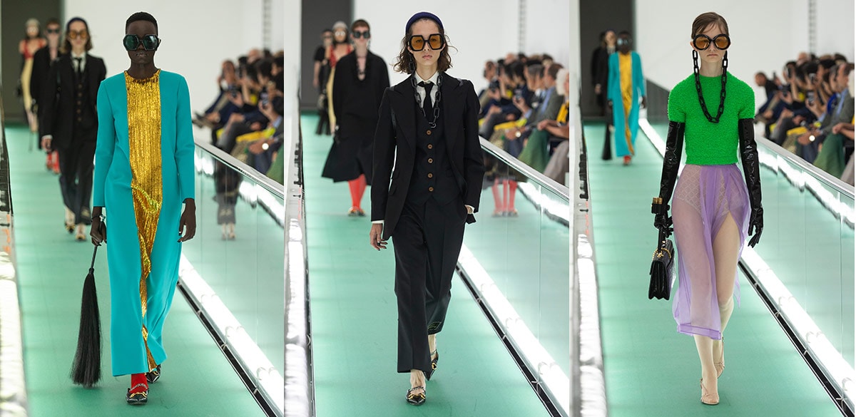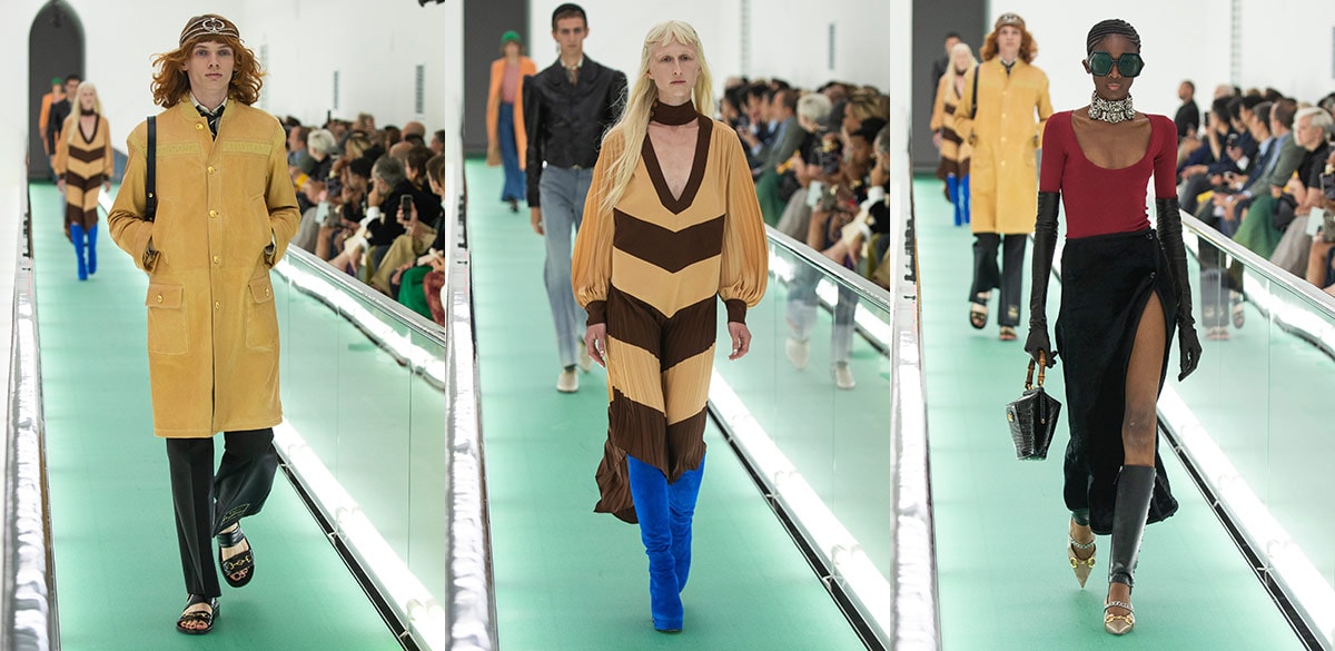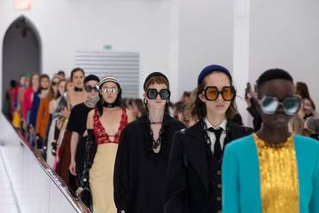 Gucci überraschte das Publikum zu Beginn seiner Schau mit Models in Zwangsjacken. Alessandro Michele, der Kreativdirektor von Gucci, hat ein großes Anliegen: Der Mensch soll sich von gesellschaftlichen Normen und Zwängen befreien. Mit diesem Leitgedanken entwirft er seine Mode. In den Zwangsjacken lag also auch eine Botschaft. Die eigentliche Fashion Show brachten Frauen und Männer gemeinsam auf den Laufsteg - in diesem Fall: das Laufband. Denn auf dem wurden die Models durch den Saal geführt. Sie trugen Anzüge mit ausgestellten Hosen, Strickpullis zu Paillettenröcken, Chiffonblusen mit Schleppe zur Samthose oder voluminöse Blousons.
