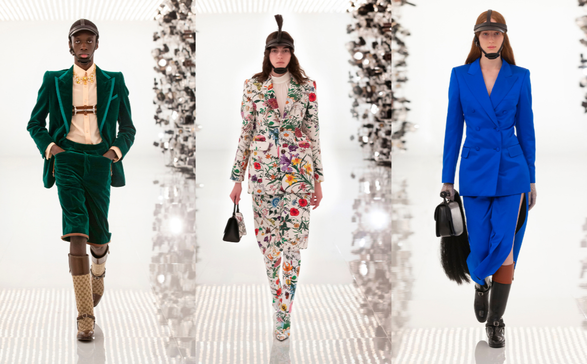 Mit Hosenanzügen aus Samt in Petrol und Marineblau, Anzügen für Frauen mit Seitenschlitzen am Rock, die bis zum Oberschenkel reichen, sowie Anzügen, die vollständig mit Pailletten bedeckt sind, sind die Schnitte ein Höhepunkt. Das Flora-Muster der Marke ist auch als ganzflächiges Motiv auf einem Anzug mit zusätzlichem Balenciaga-Schriftzug zu sehen.