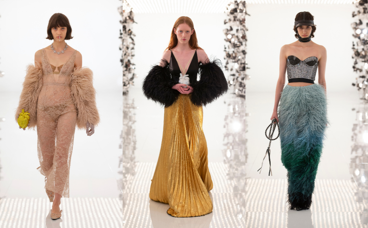 „Ich habe die nonkonformistische Strenge von Demna Gvasalia und die sexuelle Spannung von Tom Ford geplündert“, so Michele in den Notizen, die nach der Show verschickt wurden. „Ich habe mich über die anthropologischen Implikationen des Glänzenden ausgelassen und an der Helligkeit der Stoffe gearbeitet; ich habe die Reitsportwelt von Gucci gefeiert und sie in eine Fetisch-Kosmogonie verklärt; ich habe die Silhouette von Marilyn Monroe und den Glamour des alten Hollywood sublimiert; ich habe den diskreten Charme der Bourgeoisie und die Codes der Herrenschneiderei sabotiert.“