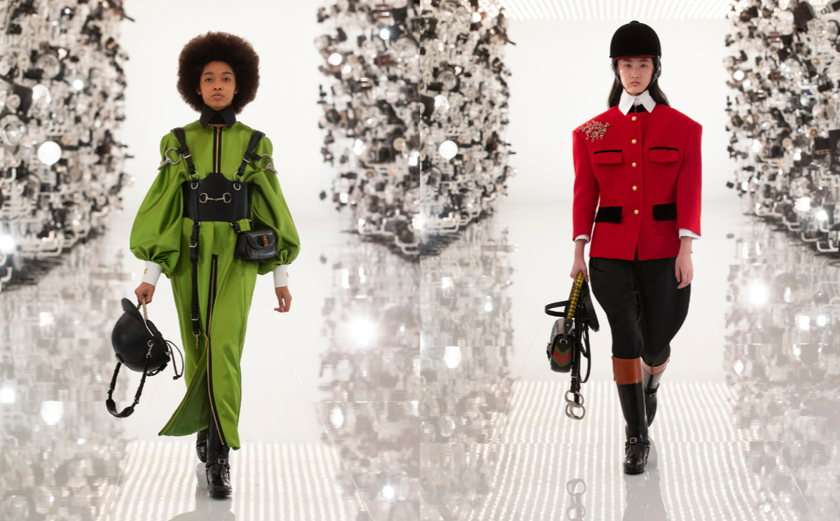 In den Notizen zur Show sagte Guccis Kreativdirektor Michele, dass die Kollektion zum Teil eine Hommage an den ehemaligen Gucci-Chef Tom Ford sowie an Demna Gvasalia von Balenciaga sei, während sie gleichzeitig die Reitsport-Wurzeln des Labels hervorhebe.