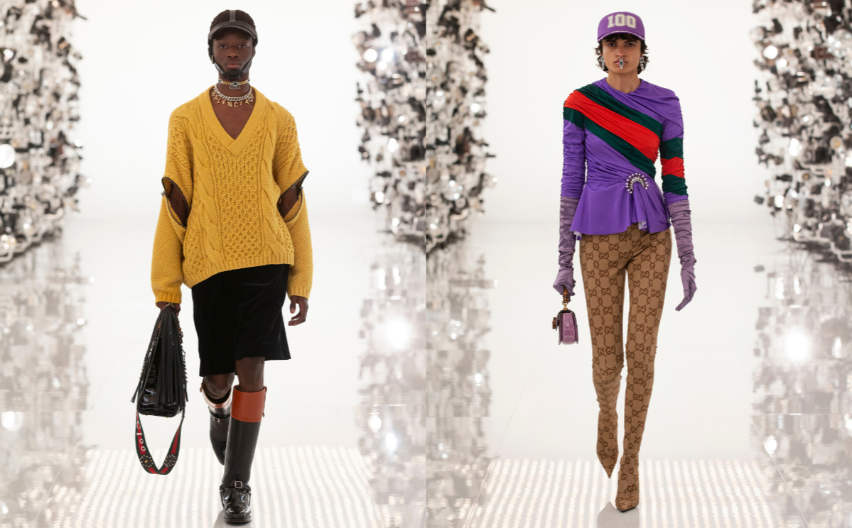 Breitschultrige Mäntel und ein mit Pailletten besetzter Rockanzug wurden mit den Gucci- und Balenciaga-Markennamen zugepflastert, während Balenciagas maßgeschneiderte Jacken mit Wespentaille mit dem ikonischen, ineinandergreifenden Doppel-G-Monogramm von Gucci versehen wurden.