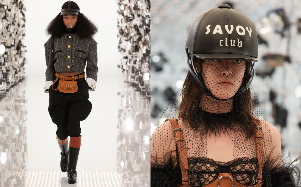 Die Kollektion hat ein pferdeartiges Flair, von voluminösen Reithosen über zaumzeugartige Halsketten und Satteltaschen, die um die Taille getragen werden, bis hin zu Stiefeln für den Stall, Reiterjacken mit übertriebenen Schultern und angeschnittenen Ärmeln, Reithelmen und sogar von Jockeys inspirierte Seidenblusen.