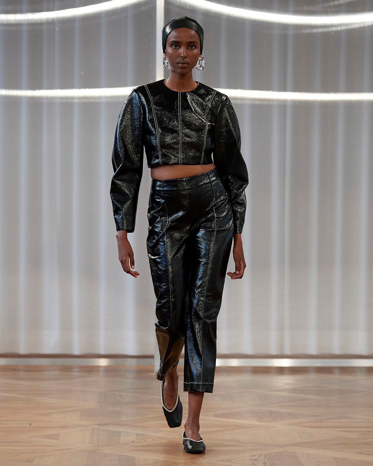 Das Label Baum und Pferdgarten entschied sich für eine klassische Laufstegpräsentation und wurde durch den Film "Die Frau, die zur Erde fiel" von 1976 inspiriert, in dem auch der Sänger David Bowie mitspielt. Die Marke wollte untersuchen, was es heute bedeutet, Mensch zu sein in einer Welt, die zunehmend digital wird. Wie Bowie zelebriert die Kollektion Individualität und Selbstbewusstsein und stach mit interessanten Drucken und Jacken, Hosen und Röcken aus ockerfarbenem veganen Lackleder hervor.