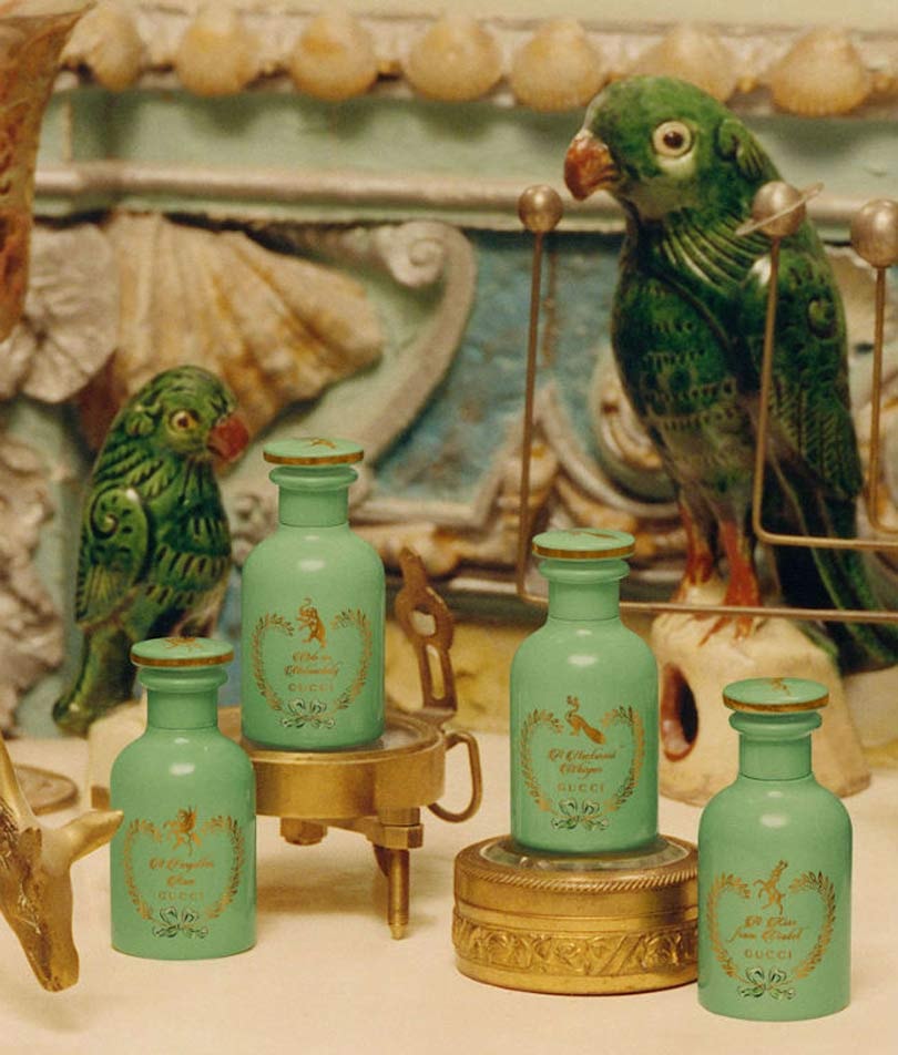 „Die neue Luxus-Duftkollektion ist der Beginn einer neuen Geschichte im Zeichen der Magie und Phantasie. Sie inspiriert sich an der antiken Wissenschaft der Alchemie, die großen Einfluss auf die antike Kunst der Duftkreation nahm und in diesen sieben Eaux de Parfum, vier parfümierten Ölen, drei Eau de Toilette und einer Duftkerze ihren Ausdruck findet“, erklärt Gucci.