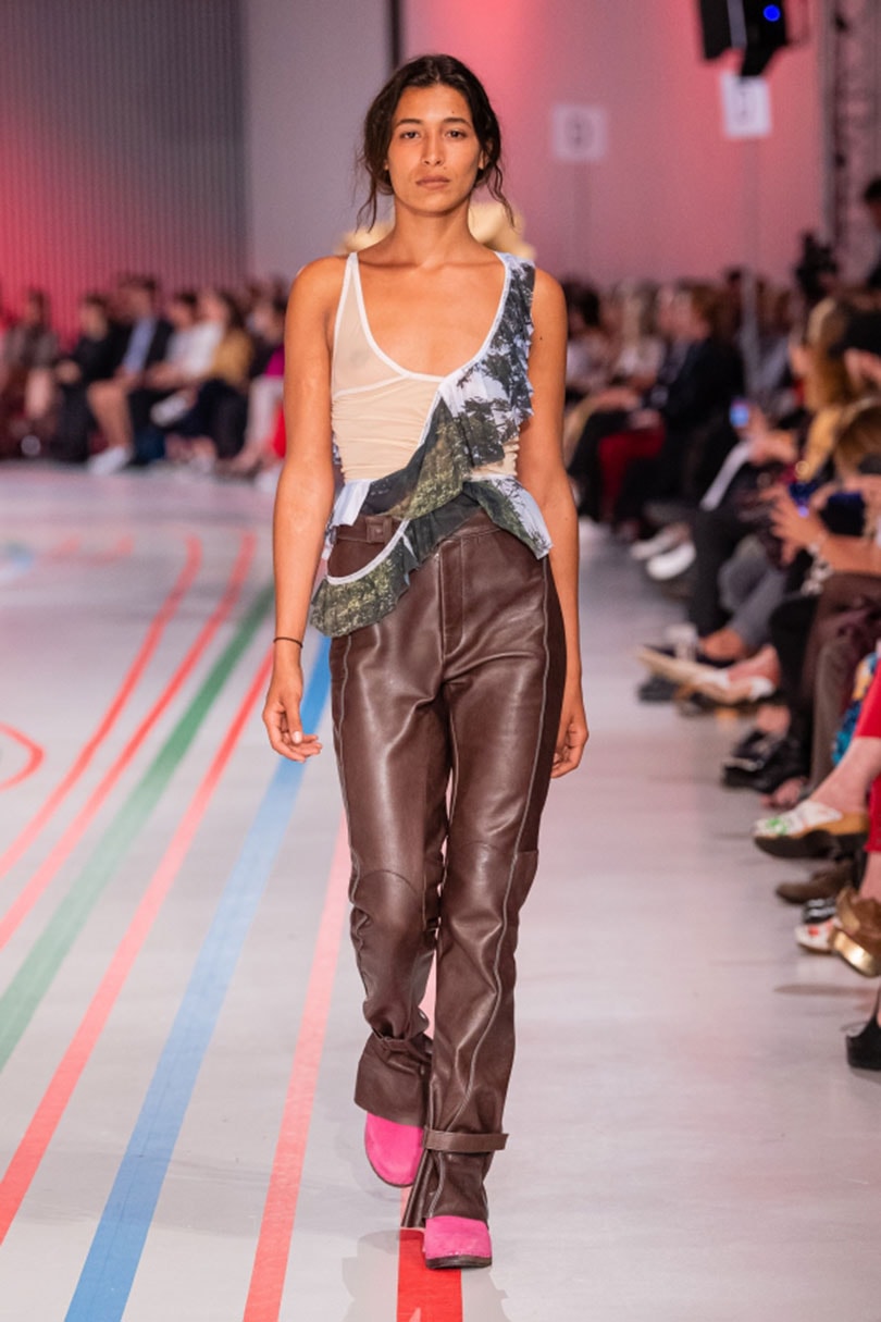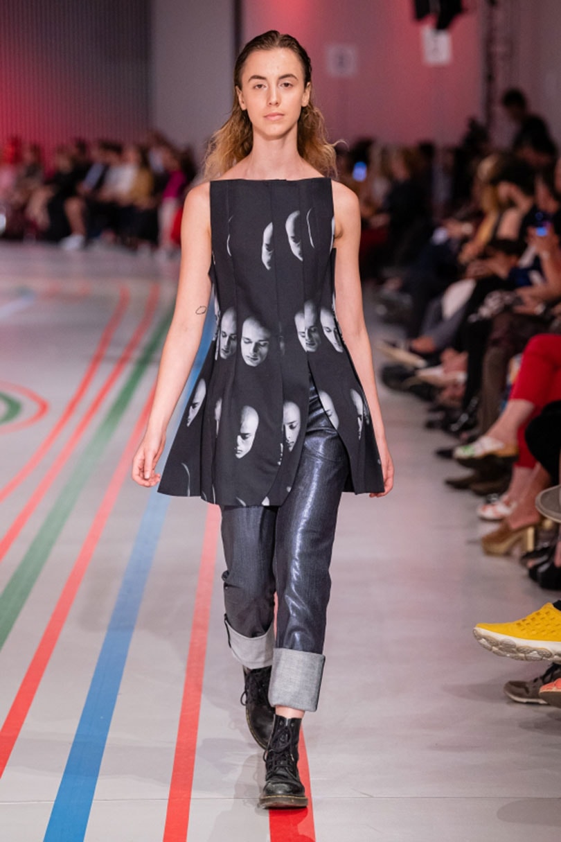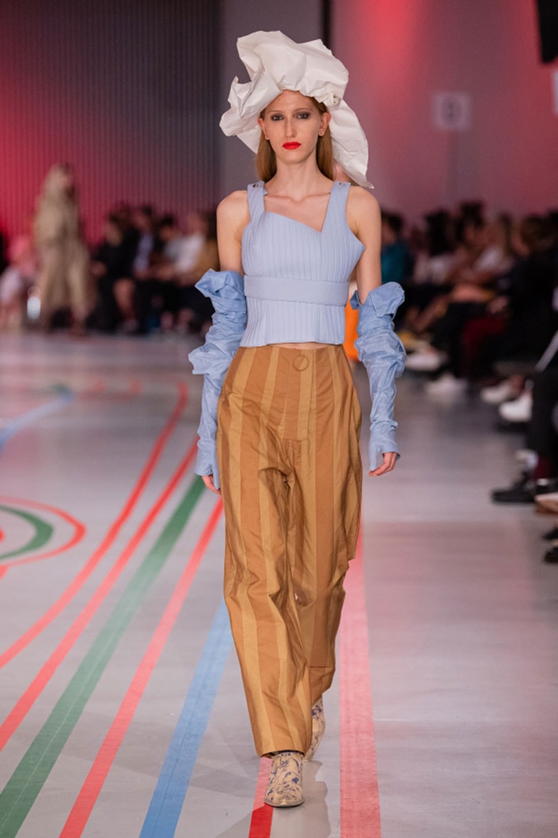 Die Diplomkollektion „Kapitál I“ von Anna Sedlmayr war eine Hommage an ihre Großmutter mit ernsthaft und düsteren, aber auch tröstlich und lustigen Outfits aus tragbaren Stücken, die einfach mit der eigenen Grundausstattung zu kombinieren sind. Ihre Kollegin Valentine Déhan stellte die meist unbezahlte und unsichtbare Arbeit von Frauen in den Mittelpunkt ihrer feministischen Diplomkollektion „Ouvrage de dame“. Sie benutzte die Schürze als Symbol, die mal verdreht oder gewickelt, über einem Catsuit oder engen T-Shirts getragen.