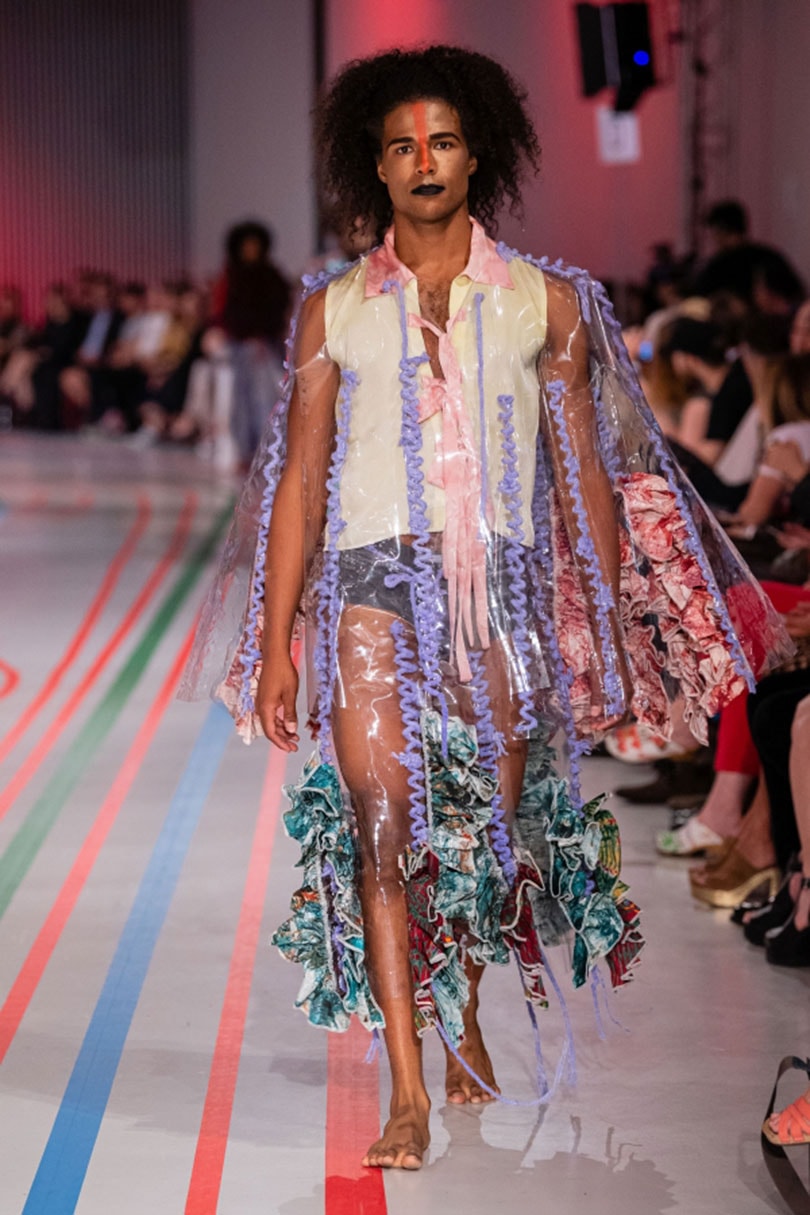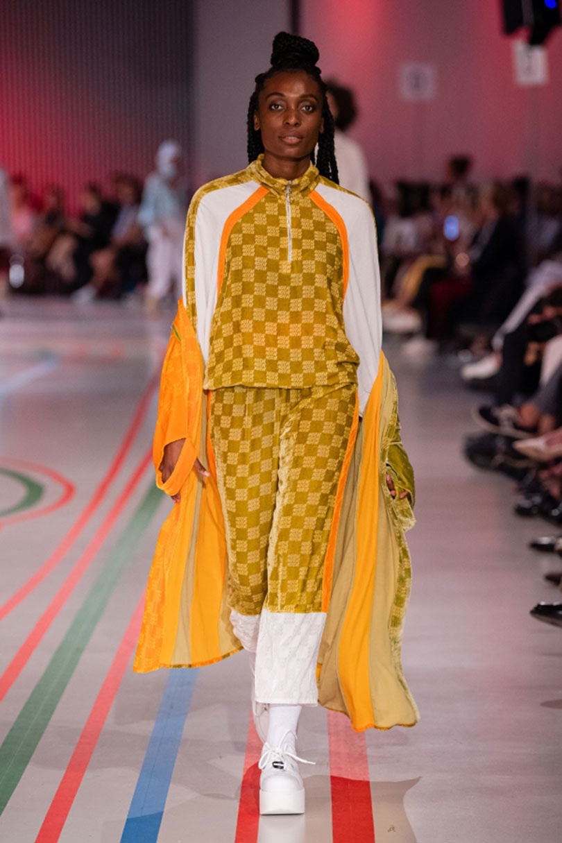 Von ihrer Heimat Nigeria ließ sich Diplomandin Motunrayo Olaogun inspirieren, deren Kollektion „Waterearth“ ihren nachhaltigen Zugang zu Design repräsentiert und sich auf das Dekonstruieren von bereits existierenden Stücken konzentriert. Farblich dominierte bei den Designs der 36-Jährigen neben dem in dem traditionellen Adire-Färbeverfahren der Yoruba-Frauen verwendeten Indigo Blau auch Rot, und fand sich beispielsweise in upgecycleten Schuhen aus Autoreifen wieder.