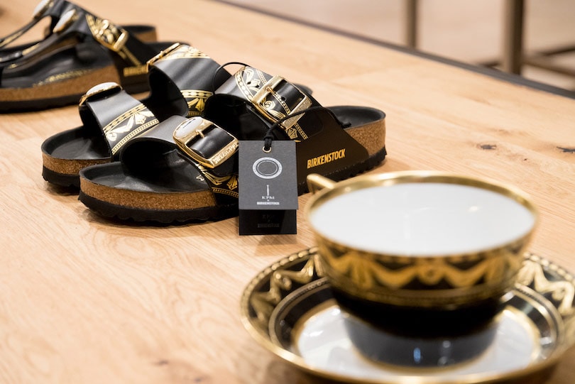 Auch auf Seiten des Schuhherstellers, der natürlich längst vom Ökolatschen-Image weg ist, wurden die Klassiker herangezogen. „Was Birkenstock und KPM verbindet, ist die Treue zum Produkt. Die Resilienz, gute Dinge nicht zu verändern“, erklärt Yvonne Piu. Stimmt. Denkt man an Birkenstock, so hat man Modell ‚Arizona‘ vor Augen: Das geformte Fußbett aus portugiesischem Kork, das seit seiner Erfindung nicht verändert wurde und zwei Metallschließen. Das Modell ‚Gizeh‘ ist mit seinem mittigen Zehentrenner fast genauso bekannt. Beide Sandalen wurden in schwarzem Leder neu aufgelegt, mit Kurland-Relief verziert und erhielten eine Porzellanlinse aus weißen Porzellan mit dem Zepter von KPM darauf - unbedenklich deshalb, weil die Porzellanmischung für die Linse zwei Mal gebrannt wurde, um das härteste Porzellan der Welt zu erzeugen. Das Produkt überzeugte, auch deshalb, weil es sich um eine limitierte Sonderedition handelt. So bleibt KPM „bei seinen Leisten“ (Lietke) bekommt aber den „Sympathiefaktor“ und Birkenstock den „Luxus und Glamour“ (Piu).