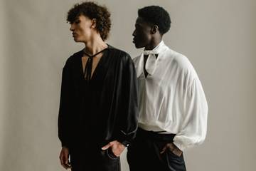 Das 2020 von dem Geschwisterpaar Frank und Nadja Lin gegründete Label Frnkow widmet sich der häufig vernachlässigten sinnlichen und gefühlvollen Seite der Männermode. Basierend auf den klassischen Formen der Herrenmode interpretieren die Stücke des Stuttgarter Labels, darunter sowohl Bekleidung als auch Wäsche, Maskulinität neu und verleihen ihnen eine subtile Sinnlichkeit, die insbesondere fließenden, weich anmutenden Stoffen und weichen Silhouetten zu verdanken sind. Neben der Stofflichkeit werden den im Schnitt maskulin anmutenden Teilen außerdem stereotypisch feminine Details wie Schleifen oder Schluppen hinzugefügt, die ein zarteres Bild der Männlichkeit zeichnen.