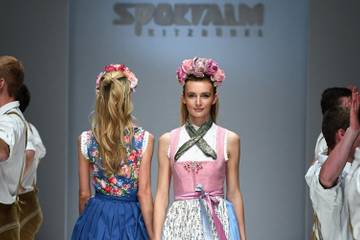 Das Kitzbüheler Familienunternehmen Sportalm schickte eine Truppe waschechter Schuhplattler auf den Catwalk, um seine neue Kollektion «Sugar Rush» vorzustellen. Dominant waren neongelbe Akzente zu hellen, oft schlangengemusterten Stoffen. Am Schluss gab's das notorische Dirndl sogar in schulterfreier Variante.