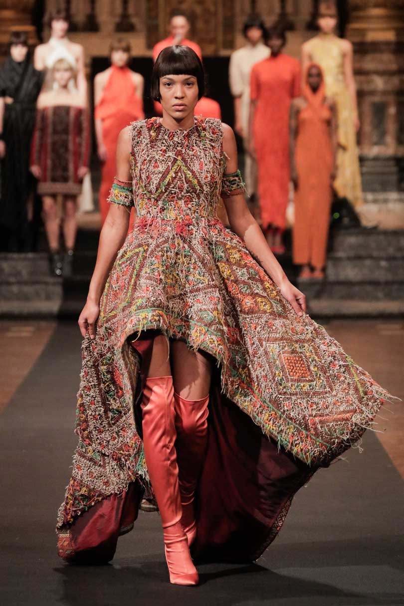 Der nächste von Edelkoort entdeckte Trend zeichnet sich schon langsam in den aktuellen Kollektionen ab. "Wir ziehen uns weiterhin elegant an, aber die Silhouetten werden definitiv weiter." Weit geschnittene Beine, geräumige Kimonos, "es kann nicht wirklich groß genug sein." In den mehr als 30 Trends, die Edelkoort während des Seminars aufführte, ist der Einfluss dieser weiten Silhouetten klar zu erkennen. „Die Jugend hat mehr Angst als je zuvor und junge Designer machen deshalb Kleidung, die die Menschen beschützt und in der man sich verstecken kann.“ Der Einfluss des Saris, wie oben erwähnt, hilft dem Trend, breite Silhouetten extra groß und fließend machen.