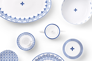 In der Kollektion ist verschiedenes Porzellangeschirr enthalten, darunter Teller, Schalen, Tassen und eine Teekanne. Das aquarellierte Blumenmonogramm des Modehauses ziert das Porzellan auf weißem Grund. Passend dazu gibt es die ‘Twist- Gläser’ in geschwungenem Design und die farblich abgestimmten Karaffen aus Muranoglas. Beide Produkte sind in den Farben Saphirblau, Bernstein, Smaragd und Rubin erhältlich.