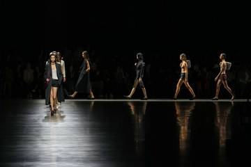 Der erste Look, der auf den Laufsteg trat: schwarze Shorts in Kombination mit einem transparenten weißen Top mit freiem Halsausschnitt, das unter einem langen dunklen Herrenmantel getragen wurde. Zu den Accessoires zählten eine klobige Halskette und eine Tasche mit langen Henkeln, die dem klassischen Modell Jackie 1961 des Labels ähnelt.