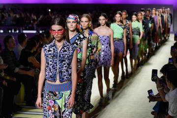 Mustermix ist angesagt: Donatella Versace hat in ihrer am Freitagabend anlässlich der Mailänder Fashion Week vorgestellten Kollektion Frühjahr/Sommer 2019 einen starken Auftritt mit vielen grafischen Ornamenten und Blütenformen hingelegt. Oft lagen die Musterbilder in mehreren Schichten übereinander und waren dann so um den Körper drapiert, dass selbst Stofffülle in einer sinnlichen Silhouette endet. Dazu viel Leder, etwa der in Python-Optik bedruckte Mantel, aber auch schimmernde Satinjacken.