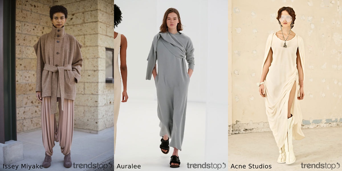 Auch vom Sport inspirierte Materialien lassen sich vom Komforttrend und dem Wachstum des Luxus-Loungewear-Marktes beeinflussen. Sportliche Jerseys werden fließender mit entsprechenden Silhouetten, die sich auf eine leichte Tragbarkeit konzentrieren. Hochwertige Garne fühlen sich weich und seidig an, verbessern den Fall und den Faltenwurf und werten einfache, schnörkellose Stücke auf, die drinnen oder draußen getragen werden können.