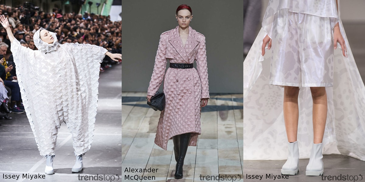 Technische und Performance-Materialien nehmen neue und ausdrucksstarke Formen an. Der Schwerpunkt liegt auf der Oberflächenbeschaffenheit, wobei heißversiegelte Polsterungen und origami-ähnliche Falttechniken eingesetzt werden, um konzeptuelle 3D-Formationen zu schaffen. Eine bereinigte Farbpalette verstärkt die futuristische Ästhetik, die auf sportliche Materialien angewandt wird, während sich die Farbklänge über Gewebe hinweg verändern und subtile künstlerische und natürliche Elemente für mehr Tiefe einführen.