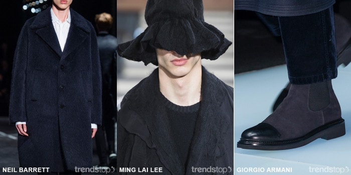 Klassisches Marineblau entwickelt sich mit einem geschwärzten Modell und bietet die modischere Variante einer Grundfarbe. Tintenschwarze Töne bieten für formelle Kleidung eine richtungsweisende Alternative zu Schwarz, während sie legeren Silhouetten einen höheren Grad an Raffinesse verleihen. Weiche, taktile Verarbeitungen und Veredelungen verbessern die Farbtiefe und verhindern, dass gesättigte Farbtöne übermäßig flach erscheinen.