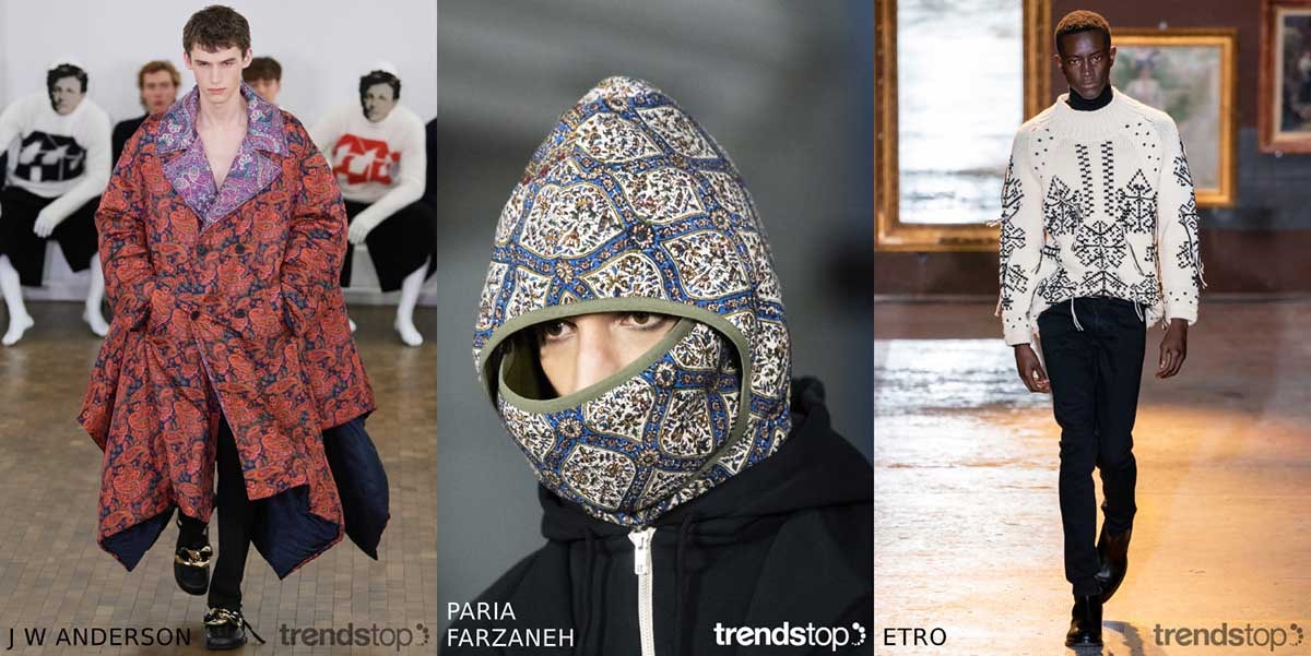 Volkstümlich-inspirierte Grafiken reisen um die Welt und lassen sich vom Nahen Osten, Indien und Skandinavien beeinflussen. Voluminöse wattierte Oberbekleidung und urbane Accessoires verstärken das zeitgenössische Gefühl traditioneller Paisley- und komplizierter Rapportmuster, während monochromatische Darstellungen nordischer Strickmode eine saubere, graphische Richtung verleiht.