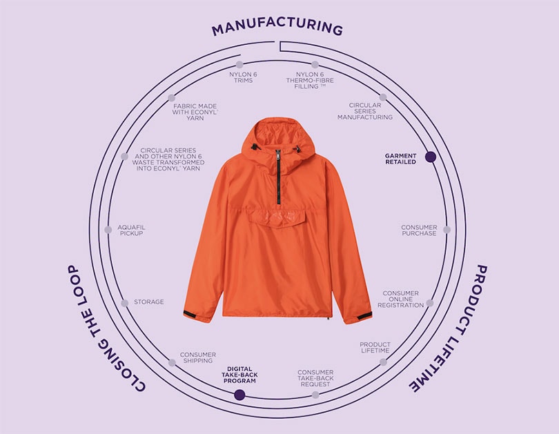 Das Füllmaterial und der Saum der vollständig recycelbaren Jacke ist aus Nylon 6 (Polyamid 6), während das Gewebe aus Econyl-Nylon besteht, wobei es sich um ein Hochleistungsgarn handelt, das aus ausrangierten Fischernetzen und anderen Abfallmaterialien recycelt wird.