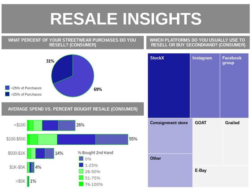Auf Platz drei liegen Reseller-Websites, die von 28 Prozent der Verbraucher als bevorzugter Kanal genannt wurden. In Anbetracht der Tatsache, dass Produktdrops ein falsches Gefühl der Knappheit erzeugen, ist es für Streetwear-Liebhaber üblich, begehrte Artikel weiterzuverkaufen, um einen Gewinn zu erzielen - nicht weniger als 69 Prozent der Befragten berichteten, dass sie mehr als 25 Prozent ihrer Streetwear-Käufe weiterverkaufen. Die meisten Befragten (70 Prozent) gaben an, nicht mehr als ein Viertel ihrer Artikel im Wiederverkauf zu kaufen, was bedeutet, dass ein Drittel aller Befragten mindestens ein Drittel ihrer Artikel ausschließlich über den Resale-Markt kauft.