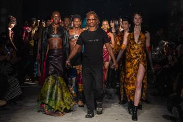 Kubi lässt sich von seinen ghanaischen Wurzeln und dem Kantamanto-Secondhand-Markt in der Hauptstadt Accra inspirieren. Für HW25 nutzte er neben dem wiederverwerteten Leder auch Holz, Raffia, Kalebassen und Deadstock-Materialien.