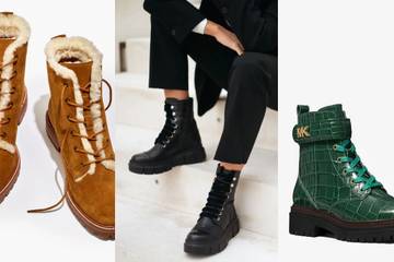 Schwarze Springerstiefel mit Schnürung passen zu allen Arten von Denim, während sich schlichtere Modelle mit allen Teilen der Garderobe kombinieren lassen. Das klassische Modell von Moschino ist ideal, wenn die Temperaturen sinken – die Stiefel haben ein schlankes Profil und tragen das Logo der Marke auf der Außenseite. Um einen Hauch von Farbe in ein tonales Outfit zu bringen, ist die Version mit Krokodilprägung von Michael Kors genau das Richtige. Sie passt gut zu einer gekürzten Jeans oder einem Strickkleid. Die mit Schmuck verzierten Stiefel von Dorothée Schumacher haben klobige Gummisohlen, sodass sie eine schöne Mischung aus zierlichen Details und Workwear-Stil in sich vereinen. Das Modell von Alohas kann dank seines komplett schwarzen Looks den ganzen Winter über getragen werden, während die gefütterte Variante von Madewell perfekt für den Winterurlaub ist.