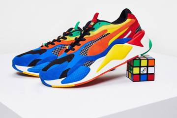 Dementsprechend können sich Puma- und Zauberwürfel-Fans auf Sportschuhe freuen, die in den klassischen Farben des letzteren gehalten sind: Blau, Orange, Gelb, Grün, Rot, Schwarz und Weiß leuchtet zum Beispiel Pumas neuer RS-X3 Sneaker, der zum ersten Mal als Teil der neuen Puma x Rubik’s Kollektion vorgestellt wird.