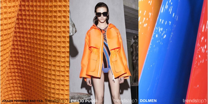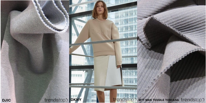 Stoffe lassen sich vom Sportbekleidungsmarkt inspirieren und konzentrieren sich auf leistungsstarke Aspekte, technische Merkmale und Misch-Innovationen. Gewagte leuchtende Primärfarben gewinnen durch hochglänzende und flüssige Glanzbeschichtungen Tiefe und Dimension, während Waffel- und Pique einen Retro-Reiz auf strukturelle Sportgewebe ausüben. Hightech-Aspekte kommen durch leichte und atmungsaktive Eigenschaften von hybridisiertem Verbundgewebe zum Ausdruck.