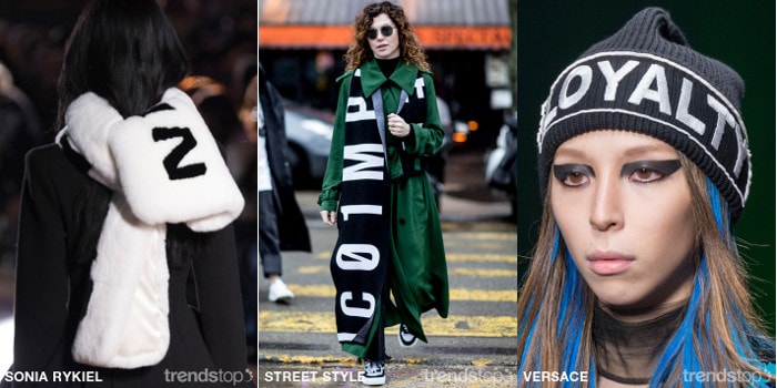 Typografische Drucke mit gewagten Slogans und Aussagen in attraktiven einfarbigen Farbrichtungen geben weichen Accessoires einen grafischen Anstrich. Kontrastbuchstaben und Streifen verstärken den sportlichen Anstrich von Stirnbändern, Fußballsocken und Fanschals.