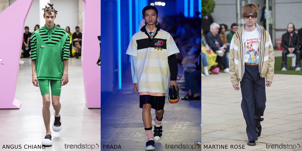 Designer blicken mit einer aktualisierten Interpretation spielerischer Nostalgie zurück in die Kindheit. Streifen von Schuluniformen und Rugby-Jersey-Silhouetten werden durch neue Proportionen und grafische Farbkombinationen modernisiert. Karikaturistische Motive schmücken T-Shirts und Tanktops und geben antikem Spielzeug und Comic-Illustrationen bis zu politischen Slogans und Popkulturbotschaften einen erwachsenen Anstrich.