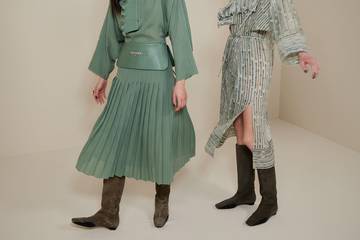 Ungefütterte, einlagige Stiefel haben eine weiche, unstrukturierte, sockenähnliche Ausstrahlung, die den Sinn für den raffinierten Komfort der Saison widerspiegelt. Handschuhleichtes, hochwertiges Leder und Stretch-Strick umhüllen Fuß und Bein wie eine zweite Haut und sind mit subtilen Kontrasten versehen, die für zusätzliches Interesse und Haltbarkeit sorgen. Leichte Sohlen in tonalen Farbtönen und kaum sichtbare, halbhohe Metallabsätze ergänzen das einfache und doch raffinierte Tragegefühl.