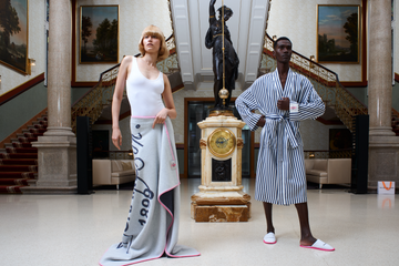 Die Teile der Kollektion sind dezent in Blau und Weiß gehalten und erhalten durch den Windsor-Schriftzug in knalligen Pink einen farblichen Akzent. Das ‘D’ des Dolder Grand ziert als großer Aufnäher die Bomberjacke und die Pyjama-Hose.