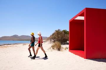 Nach etwa einem Drittel der Präsentation verlässt eines der Models den “Tunnel to joy” (auf dt..: Tunnel zur Freude), wie ihn Prada in einer Mitteilung nennt, setzt einen Fuß in den Sand und befindet sich direkt am Meer.
