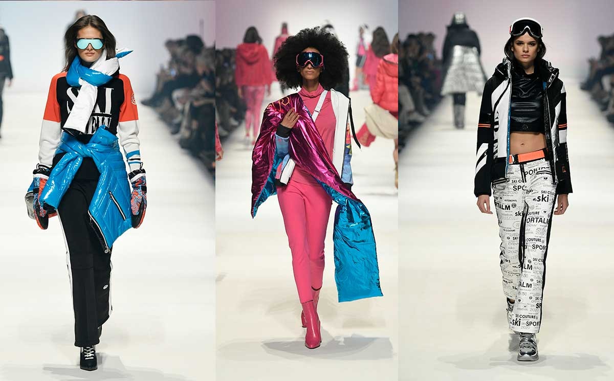 Ein Oversized-Schal in Metallic-Pink und -Blau, kombiniert mit einem pfirsichfarbenen Rolli und Leggings, sowie einem Hoodie mit grafischen Retroprints von der Skipiste. Selten schien Skibekleidung glamouröser als auf den Models, die im Januar bei der Sportalm-Modenschau über die Laufstege der Berlin Fashion Week liefen.