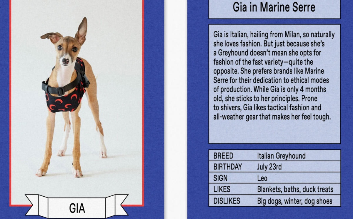 Hundefreunde, die keinen eigenen Vierbeiner haben, kommen beim Durchstöbern der Seite auch auf ihre Kosten, können sie doch die verschiedenen ‘Stars’ von Ssense samt Steckbrief in verschiedenen Outfits bewundern: Etwa den Zwergspitz Theodore in einem Hoodie von Misbhv (s.o.), Windhunddame Gia aus Mailand in Marine Serre oder den deutschen Dackel Canai aus Hörstel in Moncler Genius.