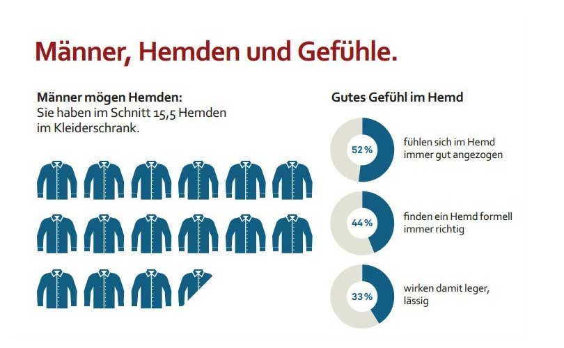 „Es ist schade, wenn die Hemden verstauben. Denn wenn sie getragen werden, geben sie ihrem Besitzer ein gutes Gefühl. Jeder zweite Mann fühlt sich laut unserer aktuellen Studie mit Hemd immer gut angezogen“, kommentierte Hentschel. Die Tendenz der Hemdenleichen ist jedoch sinkend, was auch die anhaltende Beliebtheit von Hemden bestätigt.