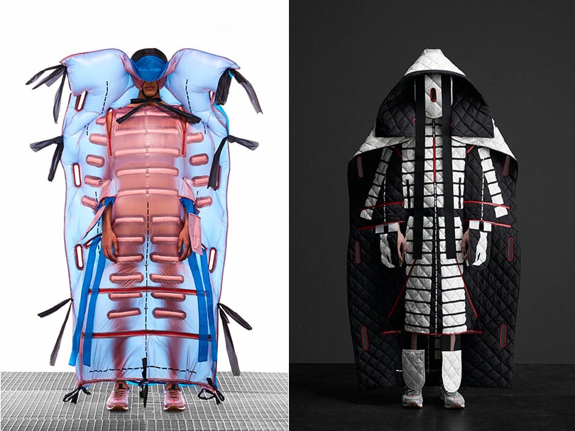 Statt auf Leichtigkeit setzt der britische Designer Craig Green auf Sicherheit. Dafür kreiert er Overalls aus Mikro-Ripstop-Nylon, einem leichten aber dennoch robusten Material. Optisch spielt er dabei mit den Moncler Daunenjacken und kreiert Silhouetten zwischen 2D und 3D. Durch das transparente Material ist der Körper im Kleidungsstück noch ersichtlich, die eigene Form geht jedoch davon ab und erinnert mehr an einen Fluganzug oder Bösewicht der Fernsehserie Power Rangers.