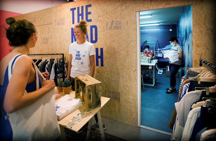 The Mad Rush, ein neuer Concept Store, hat heute in Amsterdams Einkaufsstraße de Kalverstraat seine Türen geöffnet. Kleidungsstücke verschiedener Einzelhändler sind im Schaufenster zu sehen, zusammen mit Rabattversprechen, was nichts Ungewöhnliches ist. Was Mad Rush aber von anderen Läden unterscheidet, ist, dass auf Kunden, die sich für Artikel entschieden haben, nicht die Kasse wartet, sondern ein Sweatshop.