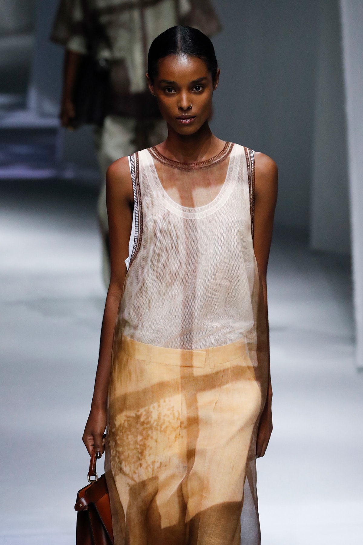Die vier Designsprachen, die Boland für die S/S 22-Saison ausmacht, sind sehr unterschiedlich. Die eine setzt auf die Klassiker, „weniger, aber besser“, die andere auf einen Mix aus Kunstformen und Collagen, mit einem Fokus auf der Natur, sowohl surrealistisch als auch wissenschaftlich. Es ist also für jeden etwas dabei, aber wie die Trendforscherin bereits andeutete, ist Kreativität im Überfluss vorhanden. Einige grobe Umrisse lassen sich aus dem Webinar skizzieren: der Wunsch nach Handwerk und Handarbeit, Oversize-Formen und skulpturale Elemente, grafische Designs und das allgegenwärtige Bedürfnis nach einer hygienischen Welt. Für die bildlich Denkenden unter uns: große Rüschen, Fransen, transparente Stoffe, Allover-Typografie, Collagen, Arbeiten mit Restmaterialien und geflochtenem Leder.