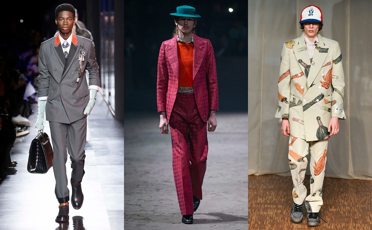 Die verrückte Fantasiewelt, die das Haus Gucci seit einigen Saisons prägt, erstreckt sich auch auf Herrenanzüge. Von diskreten stilistischen Interpunktionen bis hin zum Komplettlook, mischt es auf humorvolle Weise die Herrenschneiderei auf. Eine Stilübung, die Kim Jones, Diors künstlerischer Leiter für die Herrenkollektion, ebenfalls aufgriff. Er ließ sich von einem gewissen dekadenten englischen Chic inspirieren, und stattete seine Kollektion mit langen Paisley-Hemden, Perlenhandschuhen und Baretts mit Reißverschluss aus.